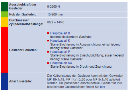 Natürlich haben blockierbare easylift Gasfedern die gleichen positiven Eigenschaften – geringe Reibungskräfte und hohe Betriebssicherheit – wie die anderen easylift Gasfeder-Typen. Die blockierbaren easylift Gasfedern erhalten Sie in Ihrer gewünschten Größe und Ausschubkraft innerhalb kürzester Lieferzeiten. |